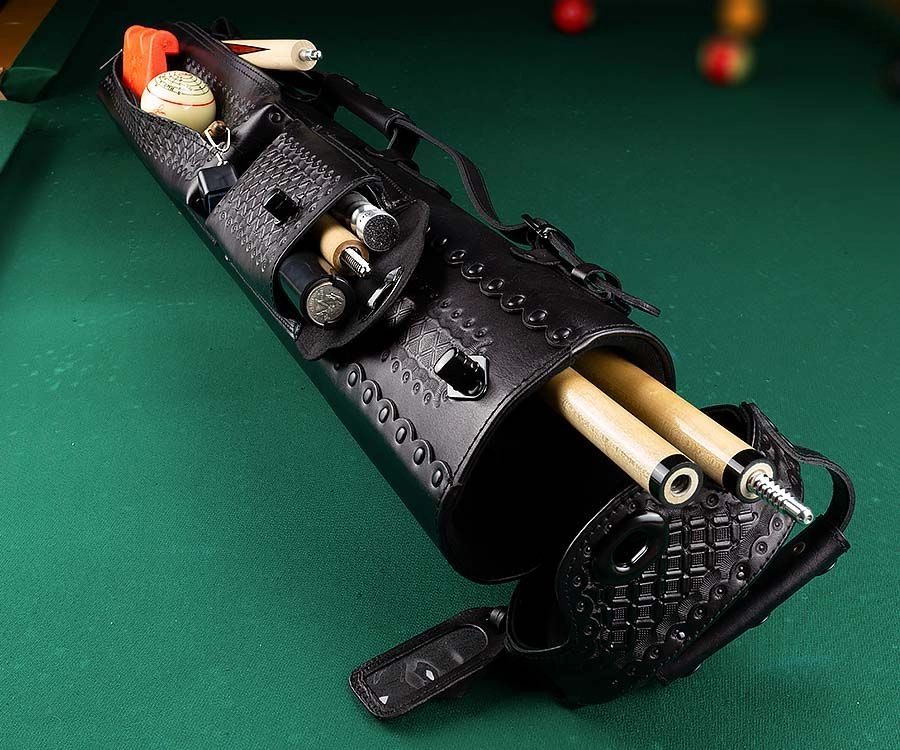 This new series of beautiful cases by Instroke are called the Southwest series and it’s pretty easy to see why they’ve been so eagerly anticipated! Each of these beauties is crafted from beautifully tooled black leather embossed with an intricate criss-cross design across the front and both pockets. This one in particular is made to fit three butts and five shafts comfortably within its felt-lined inner tubes.